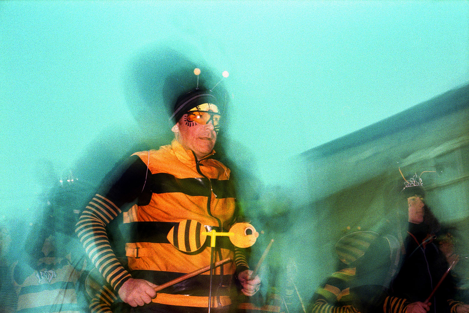 I’m a big fan of the Sheffield Samba Band, and I took the 35 GSN with me to a local lantern parade where they were performing. I left the camera on the automatic setting, but also used a flashgun with coloured gels taped over it. The aperture was set to f/11, so as the daylight faded, the shutter speed got slower and slower, running up to several seconds by the time it was dark. The result is that there is a well-defined sharp image caught by the flash, with a blurred long-exposure image superimposed.